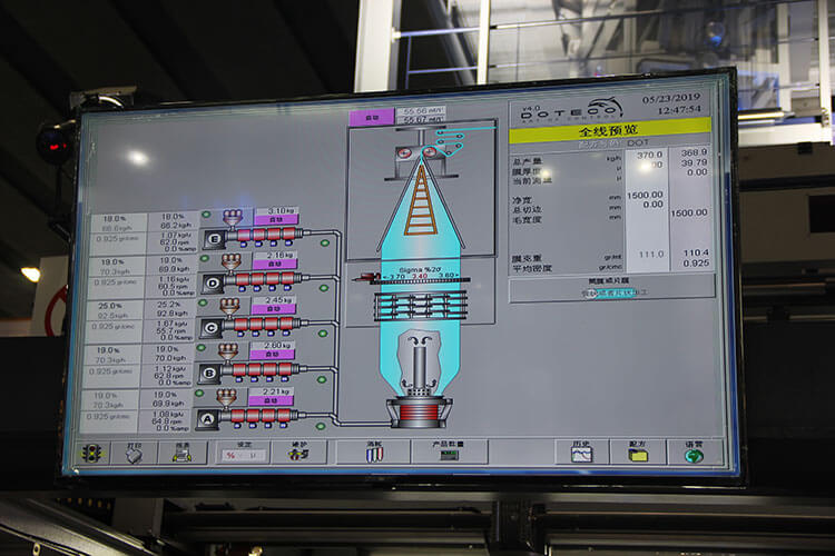 先進(jìn)的自動化模塊:五層共擠吹膜機(jī)生產(chǎn)線具有先進(jìn)的自動化功能,集中供料、配料、克重控制IBC內(nèi)冷、自動厚度控制和全自動中心收卷等。全部集成于觸摸屏集成控制。使操作更為簡便,成產(chǎn)效率提升。